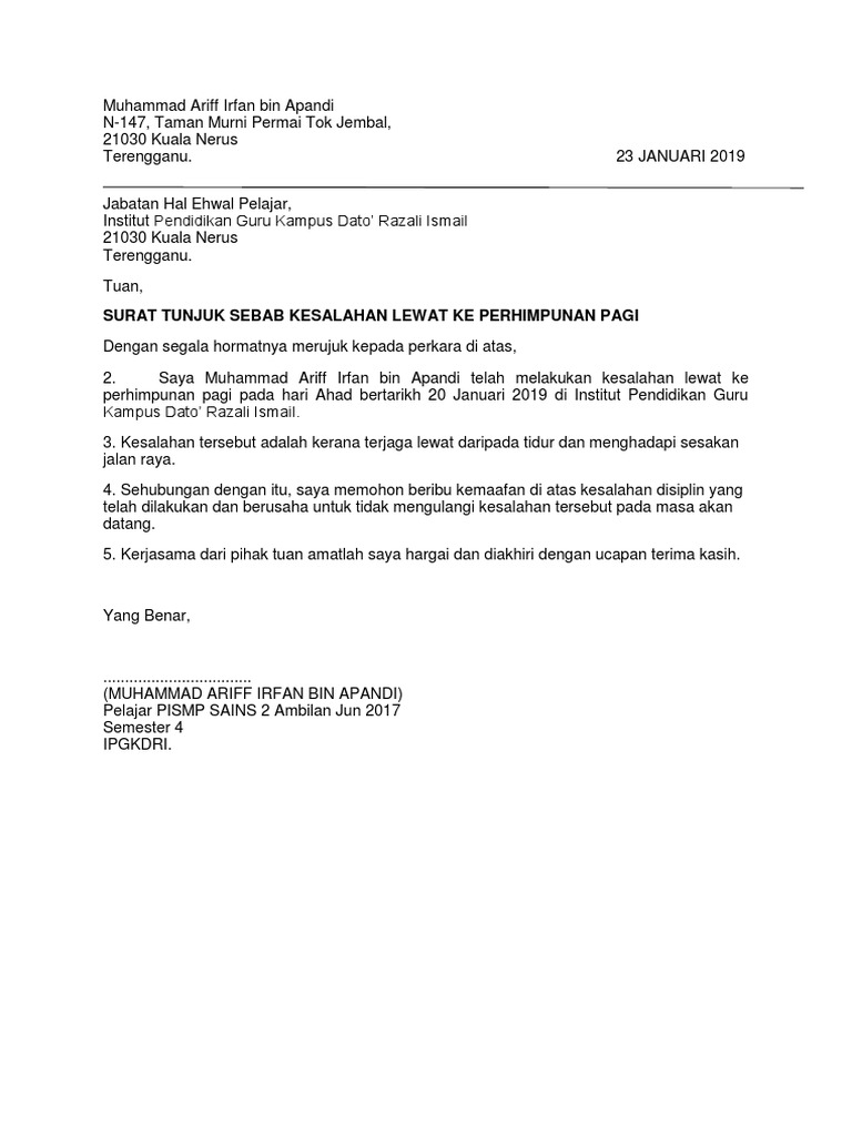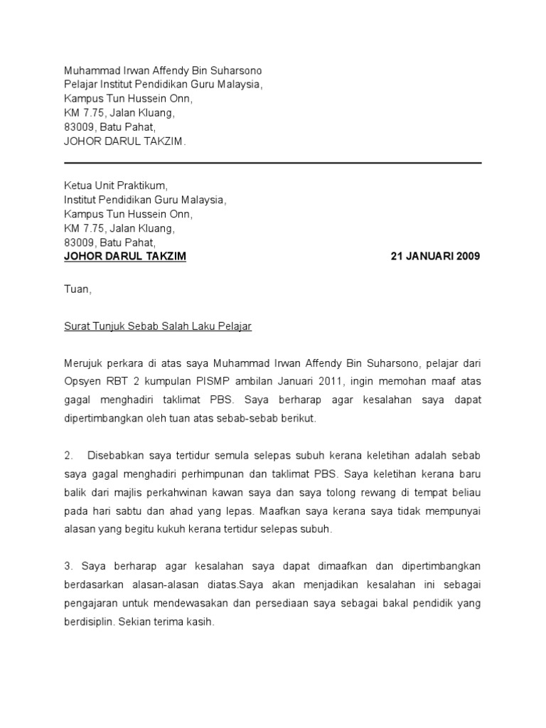 Sebagai contoh, apabila urusannya mencakup pengadilan, maka suratnya harus rinci menjelaskan tentang apa saja yang akan terjadi di dalam pengadilan. Contoh surat tunjuk sebab tidak hadir mesyuarat. Anda boleh mengubah surat ini mengikut situasi anda sendiri. Ia adalah surat tentang salahlaku pekerja daripada majikan dan wajib dijawab. Download contoh surat rasmi tunjuk sebab. Sila baca untuk lebih memahaminya dan disertakan contoh surat tsbt. Jangan lupa dibalas ya rin. Haziq abdullah abdul aziz digantung tugas serta merta dari jawatannya sebagai setiausaha sulit kanan kepada timbalan menteri industri utama, shamsul. Download & view contoh surat tunjuk sebab as pdf for free. Contoh surat tunjuk sebab lewat masuk kerja. Lebih baik lagi jika anda dapat sertakan bersama bukti yang mengukuhkan lagi alasan anda. Surat rekomendasi adalah suatu surat yang dibuat oleh pimpinan yang berisi tentang keterangan untuk mengutus seseorang baik untuk keperluan tertentu maupun permintaan. Raub km 29, kampung sebatu, jalan salim off jalan haji cherah, 77400, sungai rambai, melaka.